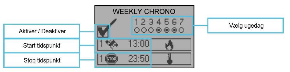 Denne funktion gør det muligt at aktivere eller deaktivere alle Chrono-funktioner på generelt niveau. Når funktionen er deaktiveret, vil ingen af de indstillede planer (Daglig, Ugentlig eller Weekend) være aktive.