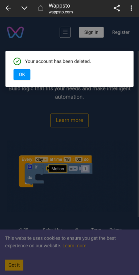 6. A browser will open confirming that your account has been deleted, and you will be logged out of the app.