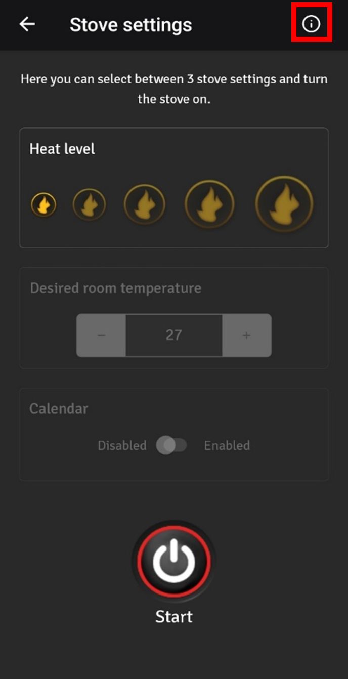 2. In the stove settings screen, tap the “i” icon in the upper right corner.
