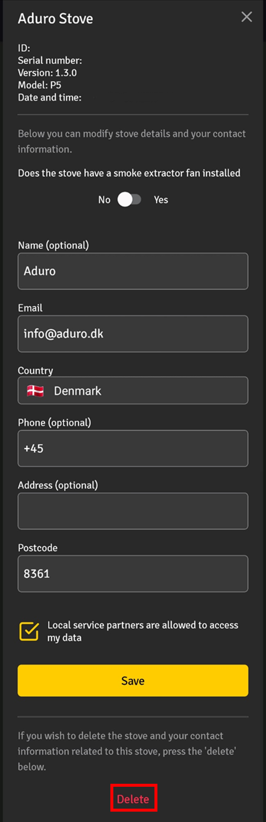 If you are selling your stove or no longer wish to have it connected to the Aduro Pellet App and cloud services, you can remove the stove directly within the app. This action will permanently delete all cloud-stored data related to the specific stove.