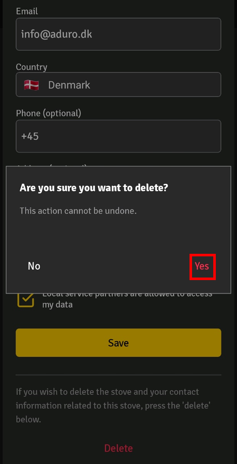 4. Confirm that you want to delete the stove. This will permanently remove all data for that stove from the cloud.