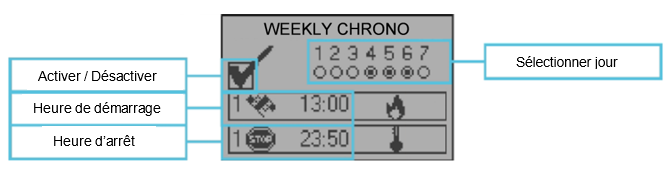 Comme dans le menu quotidien, réglez les horaires de démarrage et d’arrêt du poêle ainsi :